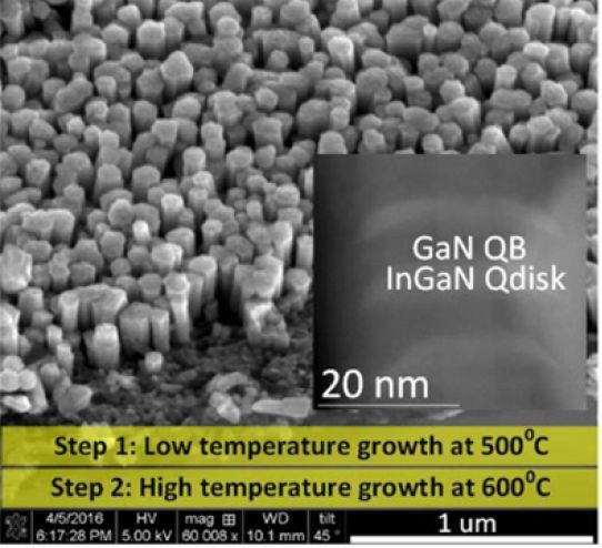 В «Истинных желтых светоизлучающих диодах в качестве фосфора для перестраиваемого указателя цветности» Лазерный белый свет », опубликованный в журнале« ACS Photonics », светодиод из нанопровода (светодиод NW), способный расти на дешевом титане (Ti) подложки на основе тонкой пленки / кремния (Si), совместимые с процессами CMOS. Его плотный нанопроволочный слой может вырасти до поверхностной плотности 9x109 см-2 с коэффициентом заполнения 88%.